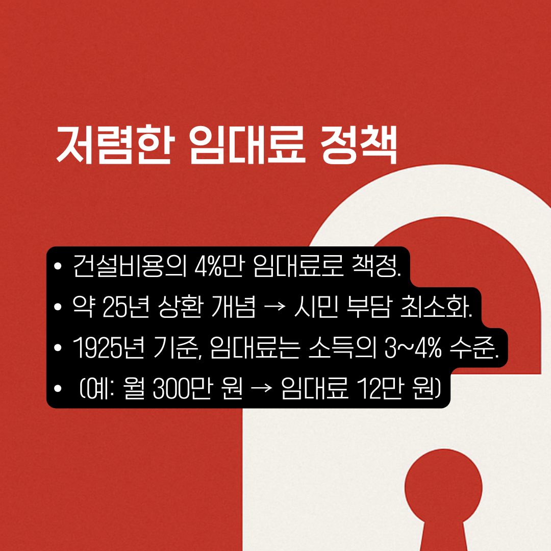 1925년 기준으로 시민들이 임대료로 지불한 금액은 **소득의 3.4~4.3%**에 불과했습니다. 예를 들어 월 300만 원을 버는 사람이라면 12만 원 정도의 임대료만 내면 되었던 셈입니다.
