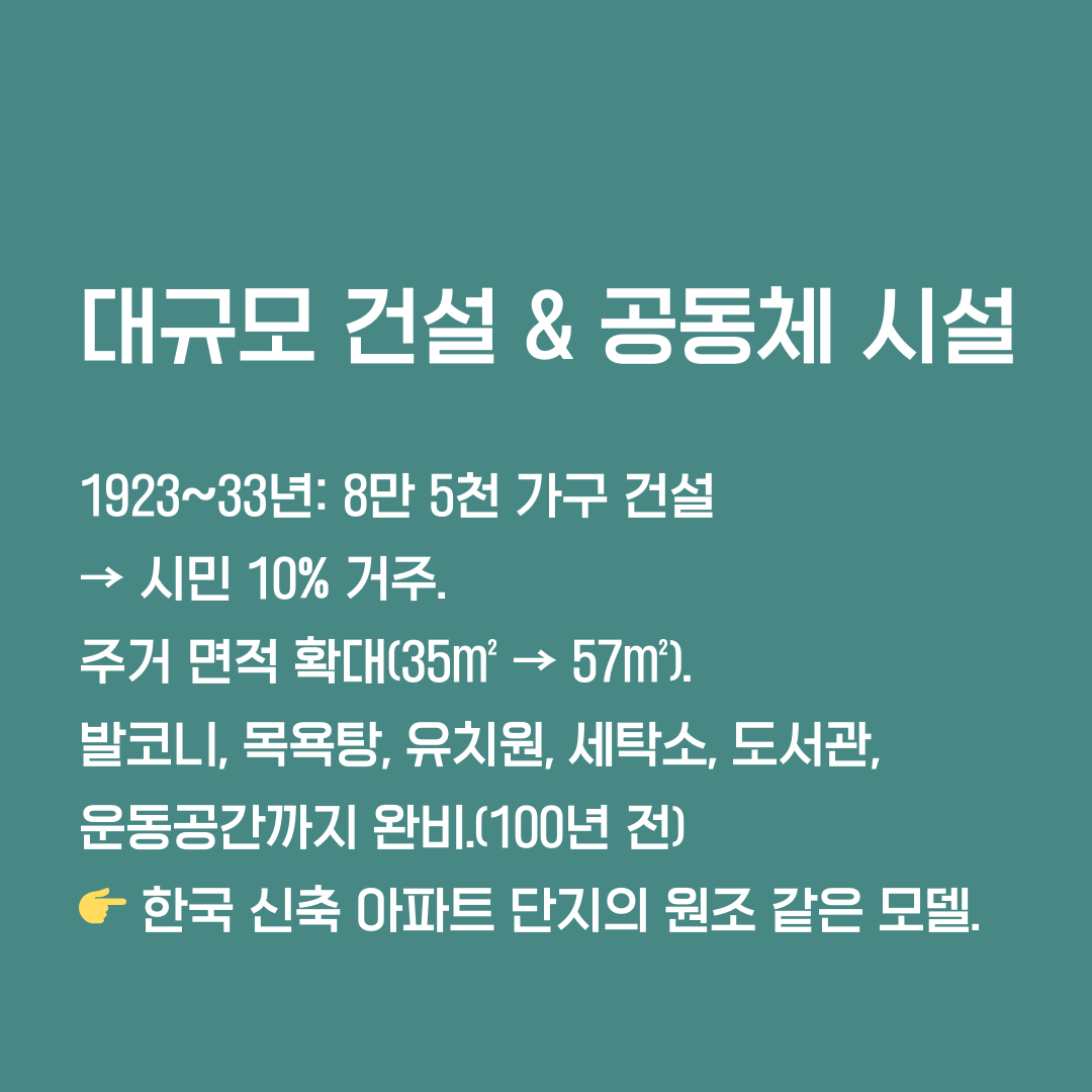 주택은 단순한 ‘잠자리’가 아니었습니다. 발코니, 공동 목욕탕, 유치원, 세탁소, 도서관, 스포츠 공간 등 다양한 커뮤니티 시설이 포함되어 있었습니다. 이는 오늘날 한국의 신축 아파트 단지 커뮤니티와도 흡사하지만, 무려 100년 전에 구현된 모델이었습니다.
