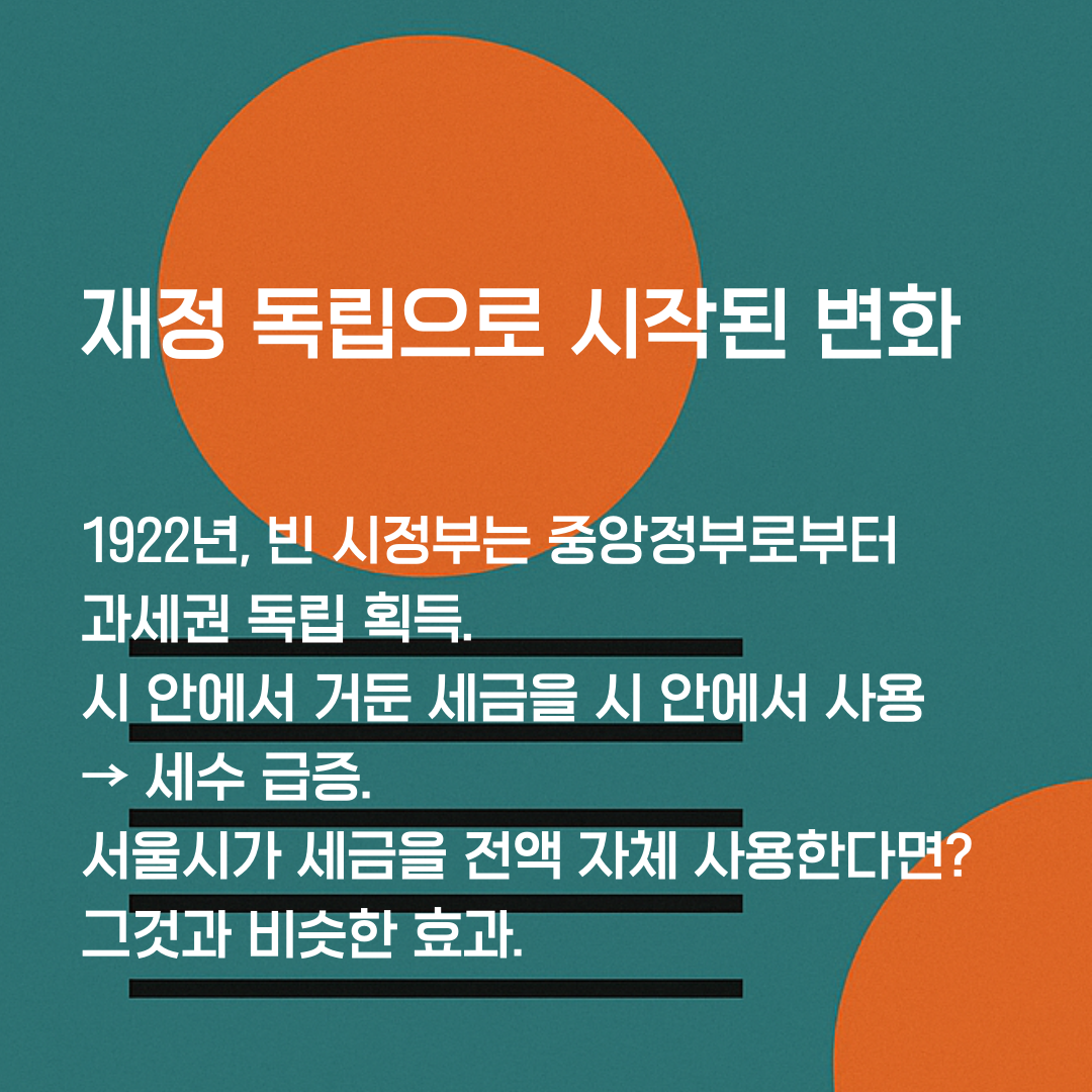 1919년, 사회민주당이 빈 시정을 장악한 뒤 가장 먼저 한 일은 중앙정부로부터의 재정 독립이었습니다. 1922년부터 빈은 독자적으로 세금을 거두고 집행할 수 있게 되었고, 이는 서울시가 서울에서 걷은 세금을 모두 자체적으로 사용하는 것과 같은 효과를 냈습니다.